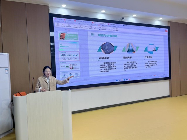 活动伊始,黄楠楠从朗诵技能概述、朗诵基础技能训练、朗诵作品选择与演绎和朗诵技能应用场景等方面展开培训,并着重对发音、气息还有情感把握等方面详细讲解,随后,她对几名现场听众进行面对面的朗诵指导,指出她们在发音上的一些不足并做出示范,最后,黄楠楠为大家分享考编的有关经验,她详细介绍了考编过程钟所需要学到的师范生专业技能,希望大家努力钻研专业技能,在实习过程中要做好信息的收集和经验的积累。