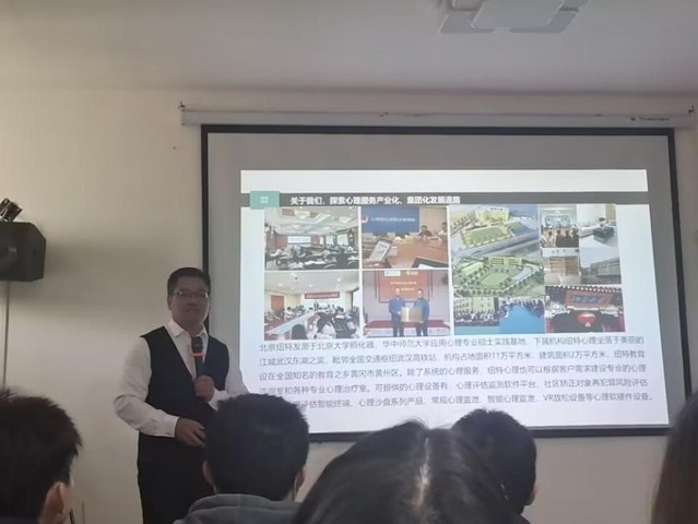 随后,22级、23级应用心理学的学生们来到基地三楼5号大教室,由纽特心理校长江普、副校长梁红老师进行了纽特心理机构介绍和应用心理学学生就业前景的授课。课堂分为以下三部分:一,具体讲述纽特教育的历史进程和服务体系;二,介绍心理咨询师的前景与未来;三,传授作为心理咨询师的实践经验。梁红老师说道:“人生是一场长跑,只要你愿意,一切皆有可能。”鼓励同学们学好应用心理学服务社会回馈社会。