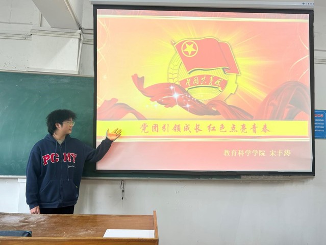 (通讯员 付豫)为进一步加强团员们对于共青团的认识,提高团员们的思想理论水平和政治素养,11月8日中午12:15,教育科学学院(以下简称“教科院”)于5406展开第五次主题为“党团引领成长,红色点亮青春”的团课。第八期团校全体学员参与此次团课,21级应用心理学1班宋丰涛担任主讲人。