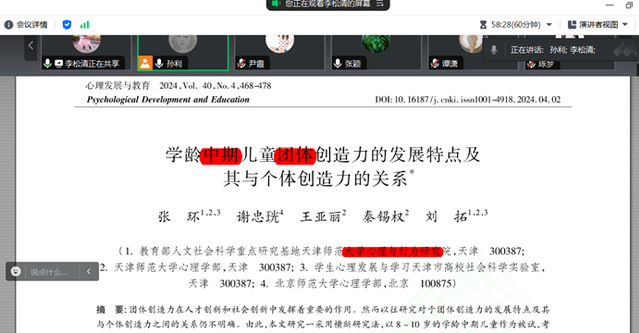 本次会议由李松清老师带领大家阅读了发表在《心理发展与教育》的2024年第4期的文章《学龄中期儿童团体创造力的发展特点及其与个体创造力的关系》。