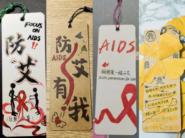 同时,参加预防艾滋病书签制作的同学也开始制作防艾书签,志愿者通过书签上的插画、图案和文字信息,引导大家积极参与防艾活动,宣传艾滋病的防治知识,帮助公众改变对艾滋病的认知和态度,促进社会对艾滋病患者的理解和关爱。