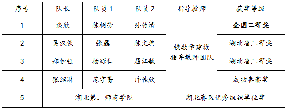 本网讯(通讯员 邹晓燕)11月10日,2023年“高教社杯”全国大学生数学建模竞赛成绩公布,我校数学与统计学院共组织7支队伍参赛,斩获本科组全国二等奖1项、湖北省三等奖2项、成功参赛奖1项,我校荣获湖北省赛区优秀组织单位奖。