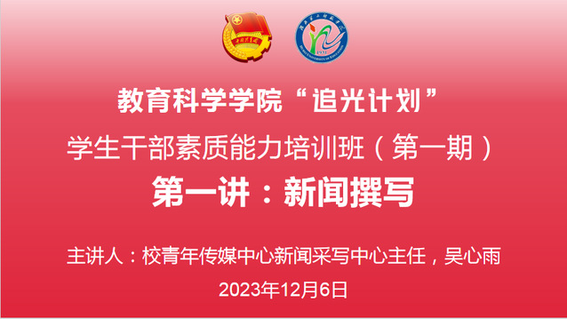 (通讯员 唐蕊)12月6日12时,教育科学学院(以下简称“教科院”)于5308开展“追光计划”学生干部素质能力培训班。教科院分党委书记乐三明,分团委副书记唐志强,辅导员关畅及分团委、学生会、青年志愿者协会全体学生干部参与本次会议。校团委新闻采写中心主任吴心雨担任主讲人。