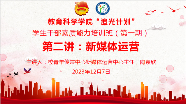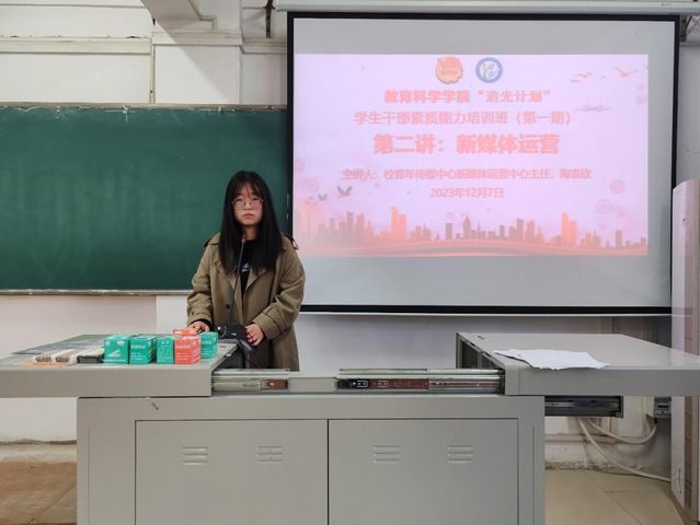 (通讯员 程婷)为进一步提高宣传技能,提升学生干部素质能力,12月7日12时25分,教育科学学院(以下简称“教科院”)于5308开展第二次培训,本次课程围绕着“新媒体运营”展开。教科院分团委、学生会、志愿者协会全体成员,其他组织主要学生干部参加本次培训课,校青年传媒中心新媒体运营中心主任陶袁欣担任主讲人。