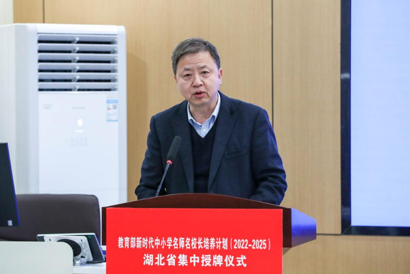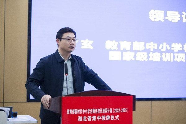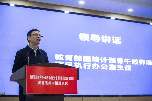 本网讯(通讯员 刘大炜)12月15日,“教育部新时代名师名校长工作室湖北省集中授牌仪式”在我校举行。教育部中小学校长和幼儿园园长国家级培训项目管理办公室副主任赵玄、教育部国培计划骨干教师培训项目执行办公室主任朱生营,湖北省教育厅教师管理处主要负责同志,我校党委副书记胡兴,名师名校长培养对象、培养基地负责人及所属地方教育行政部门领导,以及我校行知实验班师范生代表共100余人参加了授牌仪式。会议由我校教师教育学院院长王勇主持。
