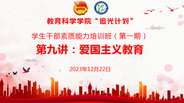 12月22日18时30分,教育科学学院(以下简称“教科院”)于阶梯教室3举行“追光计划”学生干部素质能力培训班第九讲,本次讲座围绕着“爱国主义教育”展开。教科院关畅老师、全体学生干部参加本次活动,教育科学学院关畅担任主讲人。