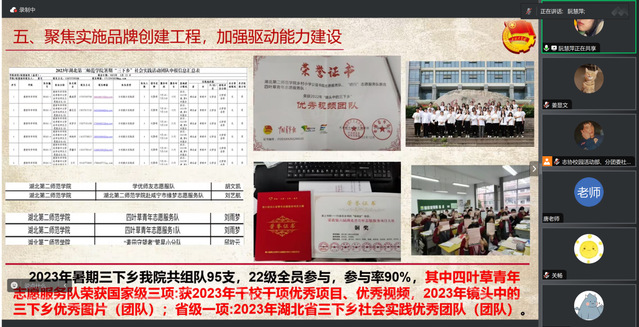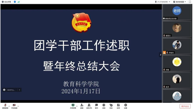 (通讯员 王佳乐)1月17日晚8时,教育科学学院(以下简称“教科院”)于腾讯会议召开2023年分团委团学干部工作述职暨年终总结大会。分团委副书记唐志强、辅导员关畅等老师,分团委、学生会、青年志愿者协会全体成员参与本次会议。