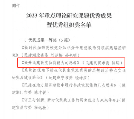 本网讯(通讯员 胡颖)近日,民建湖北省委发布《民建湖北省委关于表彰2023年重点理论研究课题优秀成果暨优秀组织奖的通报》文件,民建武汉市委常委、民建湖北第二师范学院支部主委陈珺副教授的理论研究课题《提升民建政党协商能力的思考》获2023年重点理论研究课题优秀成果一等奖。