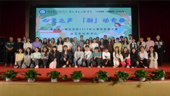 此次大赛中,教科院参赛团队用情景剧的形式引导观众们对生命的意义、存在的价值进行深入思考。我院心理情景剧《心海潮汐》以充实的内容和细腻的表演演绎出角色的心理活动,诠释了心理健康对于个体发展的重要性。本次心理剧在带给现场观众强烈情感共鸣的同时,也引发了大家对大学生心理健康的重新审视和理性思考。经过激烈的角逐,我院作品《心海潮汐》最终获得三等奖及人气剧组奖。 (图为主持人宣布获奖名单) 本次心理情景剧大赛的角逐,不仅展现了教科院学子的创新能力,也增强了学生的心理素质。心理剧《心海潮汐》获奖,既是鼓励,更是鞭策,教科院将扎实推进心理健康教育工作,引导本院学生积极关注自己的心理健康,以平和理性、积极乐观的心态对待生活。 (图为获奖团队合照) (图为教科院团队合照)