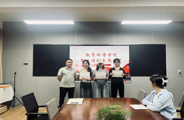 (通讯员 王佳乐)为了贯彻党的二十大精神和习近平新时代关于青年工作的重要思想,不断增强共青团工引领力、组织力、服务力。5月8日17时,教育科学学院(以下简称“教科院”)于系办组织开展“百生讲坛”优秀主讲人颁奖仪式。教科院分团委副书记唐志强及全体参赛选手参与本次颁奖仪式,22级小学教育3班李沁悦担任主持人。