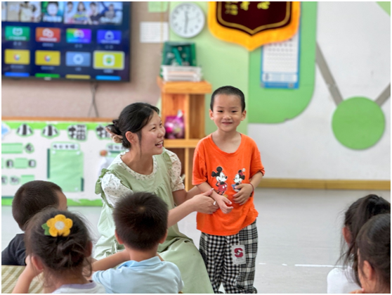 (图为在破冰活动“大风吹”上,执教小组成员引导幼儿进行自我介绍。通讯员李诗宇供图)