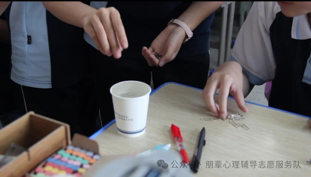 该环节学生分成若干组,老师引导学生在装满水的杯子当中放入回形针,3分钟时间内,在保证水不溢出的前提下让他