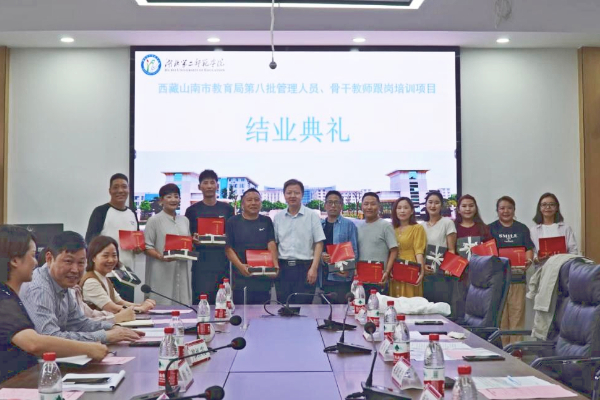 教师教育学院副院长刘晶晶宣读《关于表彰西藏山南市教育局第八批管理人员、骨干教师跟岗培训项目优秀学员的通报》。基地校负责人为学员颁发结业证书,校党委副书记胡兴颁发优秀学员证书并赠送纪念品。