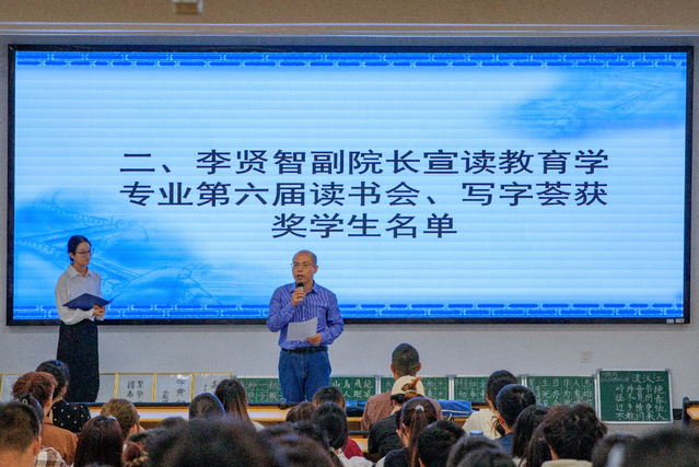 (通讯员李想 马晓艳)习近平总书记在全国教育大会上强调,要实施教育家精神铸魂强师行动,加强师德师风建设,提高教师培养培训质量,培养造就新时代高水平教师队伍。为达成“四有”好老师目标,培养师范生的综合素质与能力,我校教育科学学院(以下简称“教科院”)开展“师陶学陶”系列活动,以陶冶师范生的师德师风、学识学风。2024年10月17日下午1:30,教育学专业在博雅楼420开展第六届“写吧”写字荟、“读吧”读书会颁奖典礼暨2023级、2024级教育学专业导师见面会。教科院党委书记乐三明、教科院副院长吴贤华、教科院副院长李贤智,以及教育学专业全体教师参加。典礼由2024级教育学1班洪圆圆同学主持。