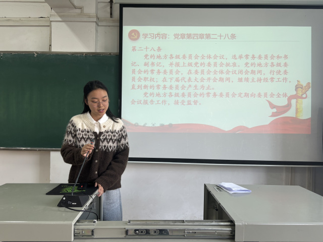 随后,郭永康带领全体党员学习本次主题党日活动相关内容:习近平总书记在党的二十届三中全会第二次集体会议上发表的重要讲话、习近平总书记《论教育》一书中关于教育的重要文稿、习近平总书记在全国教育大会上发表的重要讲话等。接着,进行了党的理论知识竞答环节,进一步加强党员的思想教育。最后,进行了红色影视片段观影环节,罗晗菁、魏子怡两位党员分别进行了观后感发言。