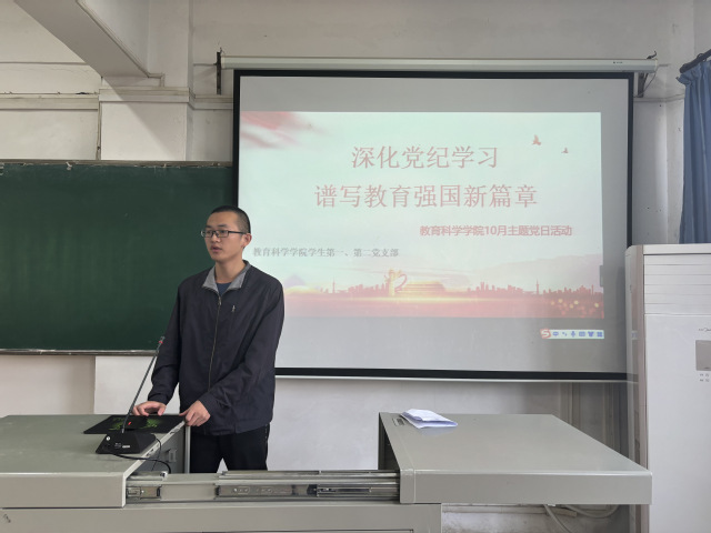 (通讯员 刘畅)10月23日12时,教育科学学院(以下简称“教科院”)学生第一、第二党支部于五号楼5308联合开展10月主题党日学习活动,此次活动的主题为“深化党纪学习,谱写教育强国新篇章”。学生第一党支部书记代黎明、学生第二党支部书记杨霞、全体学生党员参与活动,22级小学教育1班郭永康主持。