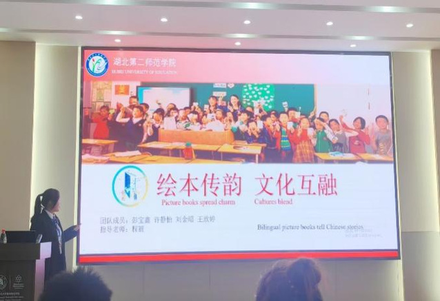 参会院校学生代表以学校为单位进行全英文汇报。我院和计算机学院共8名同学代表湖北第二师范学院参赛,其中学前教育中外合作办学项目22级学生王欣婷、彭宝鑫、刘金昭、许静怡围绕“绘本传韵,文化互融”这一项目主题,从内外背景分析项目起源,通过绘本材料收集,制作,分享三个方面展现项目开展的全过程,展现了中美学前教育绘本文化交流的底蕴。经过参会学生人气投票,湖北第二师范学院教育科学学院和计算机学院项目荣获第三名。