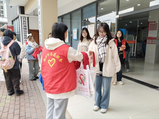 (图为志愿者接受活动纪念袋)