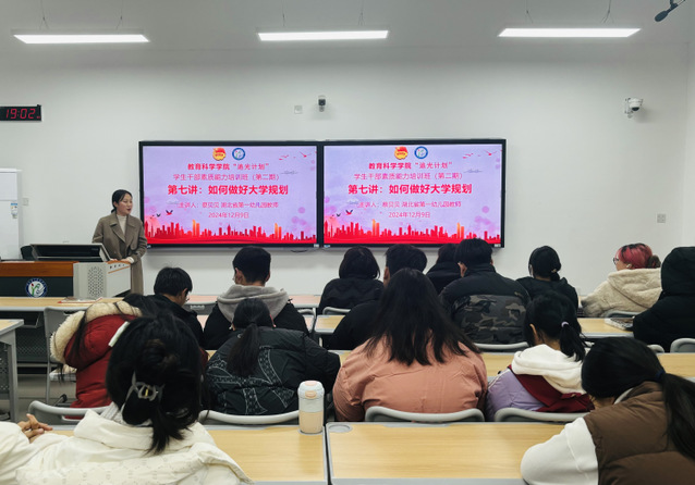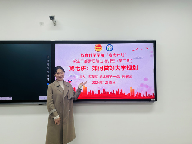 (通讯员 刘畅)12月9日18时30分,教育科学学院(以下简称“教科院”)于博雅楼507室举行2024“追光计划”学生干部素质能力培训班第七讲。本次培训邀请了湖北省第一幼儿园教师、教科院2024届优秀毕业生蔡贝贝为主讲人,培训主题为《如何做好大学规划》。教科院分团委副书记唐志强以及教科院学生会、分团委、志愿者协会、各社团骨干等参加本次活动。