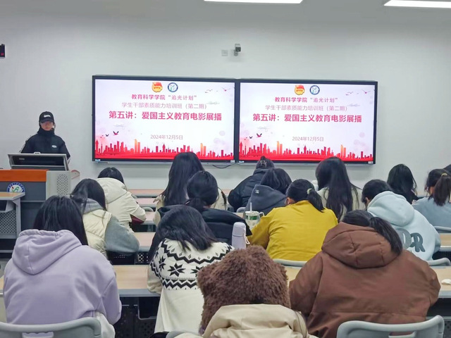 (通讯员 胡奥琦)12月5日18时30分,教育科学学院(以下简称“教科院”)于博雅楼502举行2024“追光计划”学生干部素质能力培训班第五讲。本次培训的主题是《爱国主义教育电影展播》,教科院学生会、分团委、志愿者协会、各社团骨干等参加本次活动。