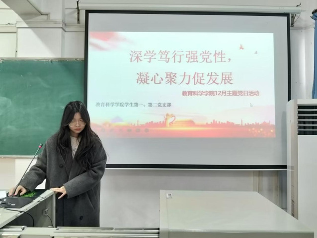(通讯员 马骋)12月19日12时,教育科学学院(以下简称“教科院”)学生第一、第二党支部于五号教学楼5308教室联合开展12月主题党日活动。本次活动主题为“深学笃行强党性,凝心聚力促发展”。支部全体党员参加,22级小学教育1班谷雨主持。