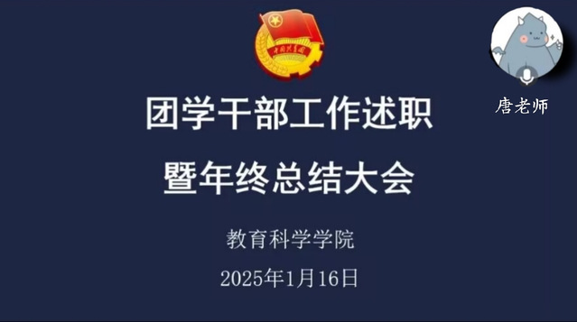 (通讯员 胡奥琦)为全面总结去年学生工作,明确明年工作方向,进一步加强学生干部队伍建设。1月16日晚上8时,教育科学学院(以下简称“教科院”)团学干部年度述职与年中总结大会在腾讯会议隆重举行。分团委副书记唐志强,辅导员关畅、龚敏、任淑叶参与会议,分团委副书记戴逸雪主持。