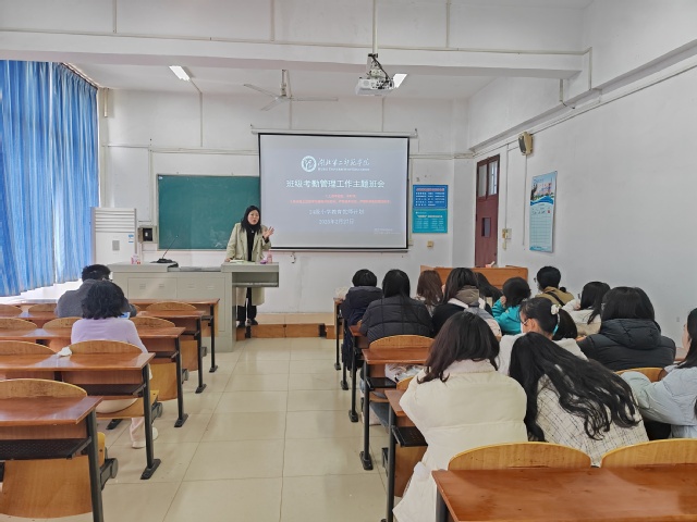 龚敏老师就学生管理工作提出具体要求,强调落实考勤管理制度的重要性。龚老师指出课堂出勤率与学业成绩呈显著正相关,要求全体学生严守零迟到、零旷课纪律底线。在安全管理方面,重点部署了防范电信诈骗教育周活动,并明确校外住宿审批制度,重申严禁擅自校外租住的管理规定。