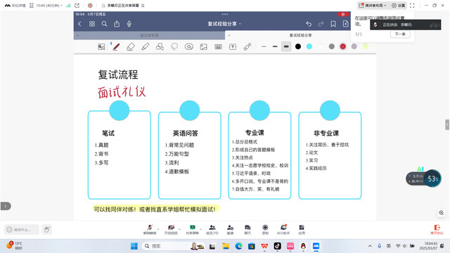 本次考研复试及转型线上分享会的成功举办,搭建了一个考研经验的交流平台,同学们得到了于优秀毕业生代表交流的机会,为各位考研的同学们提供了宝贵的经验和指导,希望在优秀毕业生的经验传授下2025届的考研学子们可以在复试中发挥最佳水平与此同时为下转型就业做好准备。