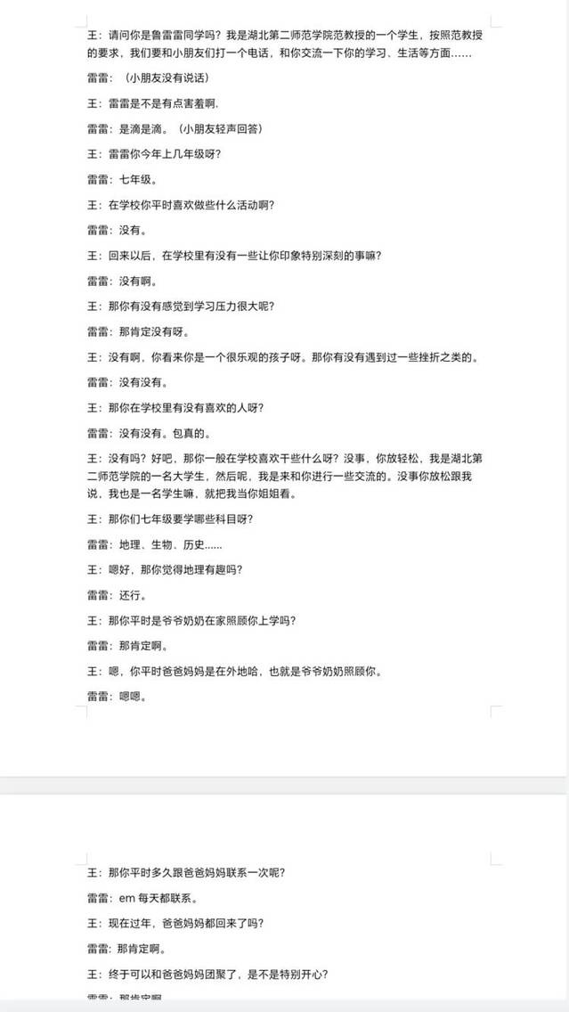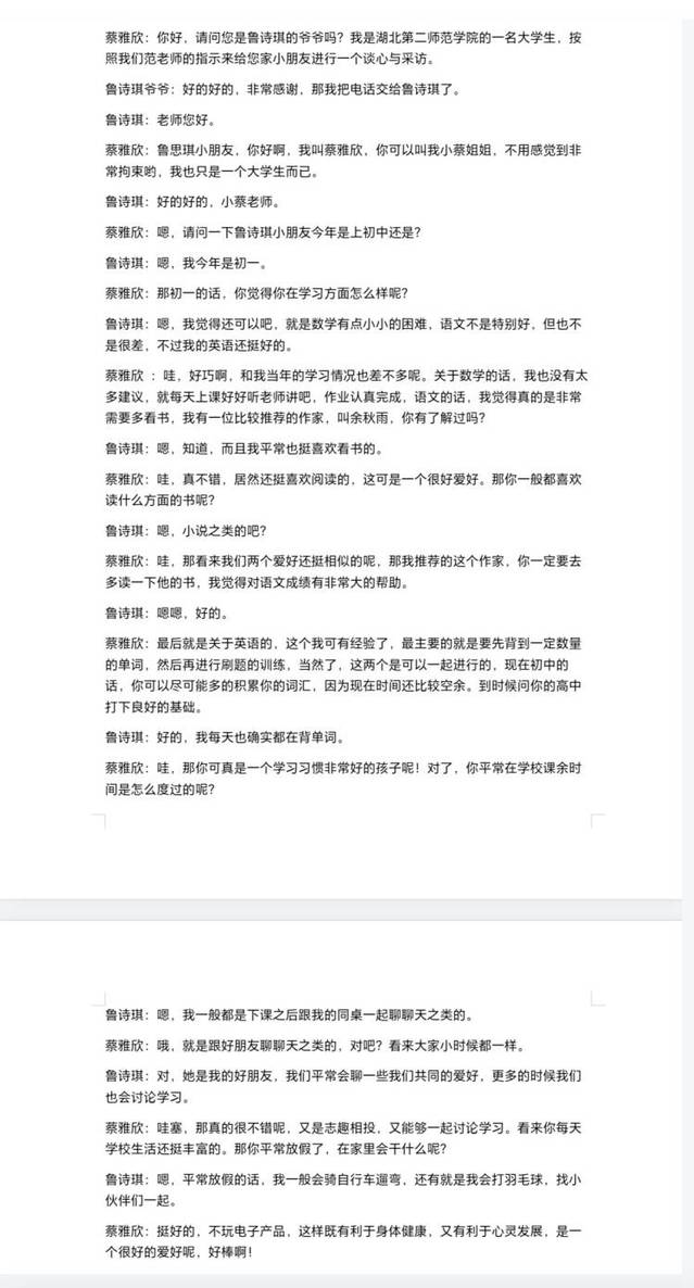 (通讯员 王高若 蔡雅欣)2024年至 2025年寒假期间,湖北第二师范学院小学教育优师班的四名同学积极投身于一项温暖人心的活动——给留守儿童打电话,为那些缺少父母陪伴的孩子们送去关怀与鼓励。此次活动中,鲁雷雷和鲁思琪两位小朋友成为了她们重点连线交流的对象。