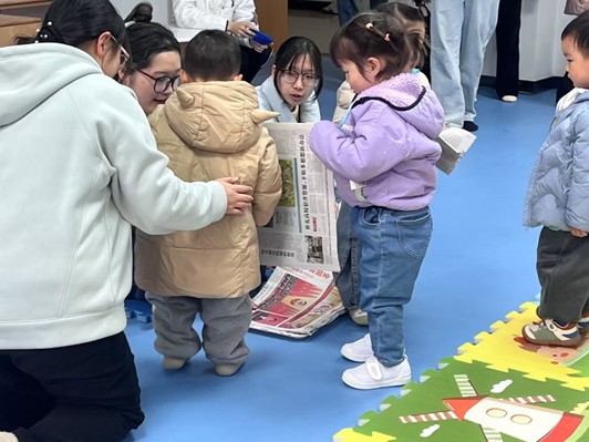 上午九时,学生志愿者在校门处热情接待陆续到场的家长与幼儿。孩子们在专业学生指导下通过《好玩的报纸》活动,学习安全剪刀使用规范,通过裁剪报纸,锻炼幼儿精细动作的发展;活力投掷则通过报纸球投掷游戏,让亲子在竞技中培养协作能力;记录区特别设置单向玻璃观察室,学前教育专业学生通过定点观察、行为记录,形成评估报告等专业文档。
