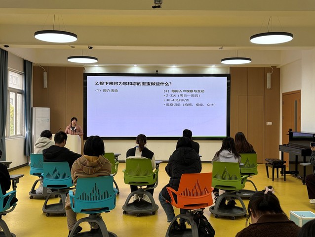 活动结束后,全体师生立即开展教学反思会。通过回看录像、分析观察报告、梳理家长反馈等环节,对教学、活动组织、应急处理等多个维度进行评估评价。陈纳老师强调:这是将课程知识转化为实践能力的重要练兵,我们要建立'实践-反思-优化'的闭环培养模式。徐梦雪老师带宝宝到场,体验了活动并给同学们提出了需要注意的方面。