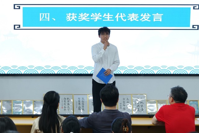 随后,钢笔字一等奖——22级教育学专业黄宇杰同学登台发言。他从三个方面展开分享