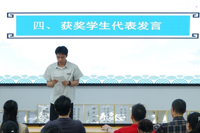 (图为粉笔字一等奖获得者余定富同学做代表发言)