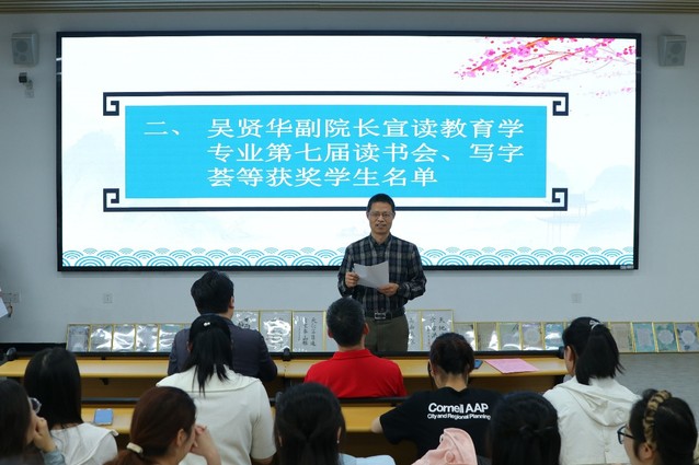 (通讯员 马晓艳)为了贯彻落实习近平总书记有关“四有好老师”“立德树人”等讲话精神,秉承伟大的人民教育家陶行知先生的“教学做合一”理念,将教育名家的精神融入新时代教师队伍建设,教育科学学院(以下简称“教科院”)开展了“四有好老师”之“师陶学陶”系列活动,以陶冶师范生的师德师风、学识学风。2025年4月17日下午一点,教育学专业师生在博雅楼320开展第七届“写吧写字荟”“读吧读书会”暨教育家精神宣讲优秀作品颁奖典礼。教科院分党委书记乐三明、教科院院长张炜、教科院党委副书记魏豪、教科院副院长吴贤华、教科院院长助理曾婧,教科院21级辅导员关畅,22级辅导员郭希,24级辅导员任淑叶以及教育学专业全体教师参会。典礼主持人为22教育学1班汪琳。