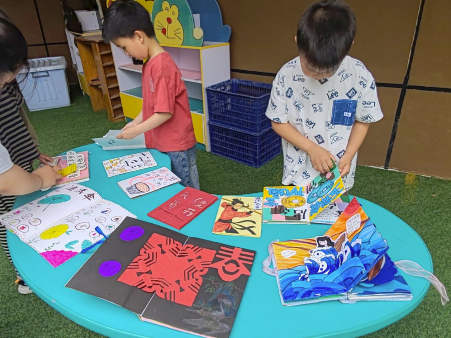 户外绘本分享环节,团队成员特别选用植绒材质、带立体拼插结构的非遗主题绘本,引导孩子们通过触摸刺绣纹样、拼装传统建筑构件来理解文化符号。团队成员与孩子们共读绘本,成员们耐心地为孩子们讲解绘本中的故事内涵,破译绘本的各种机关,与孩子们积极讨论交流,在轻松愉快的氛围中,进一步帮助他们感受绘本魅力,理解文化意象。