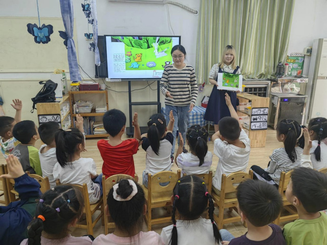 室内教学部分,志愿者通过绘本故事与数字化教学相结合的手段,通过智能白板呈现会动的剪纸角色,结合触控屏幕实现绘本场景交互,生动地展示绘本内容。以充满趣味的语言和活泼的互动方式,引导孩子们积极参与课堂,在帮助孩子们理解绘本故事的同时,激发了他们的想象力和语言表达能力。