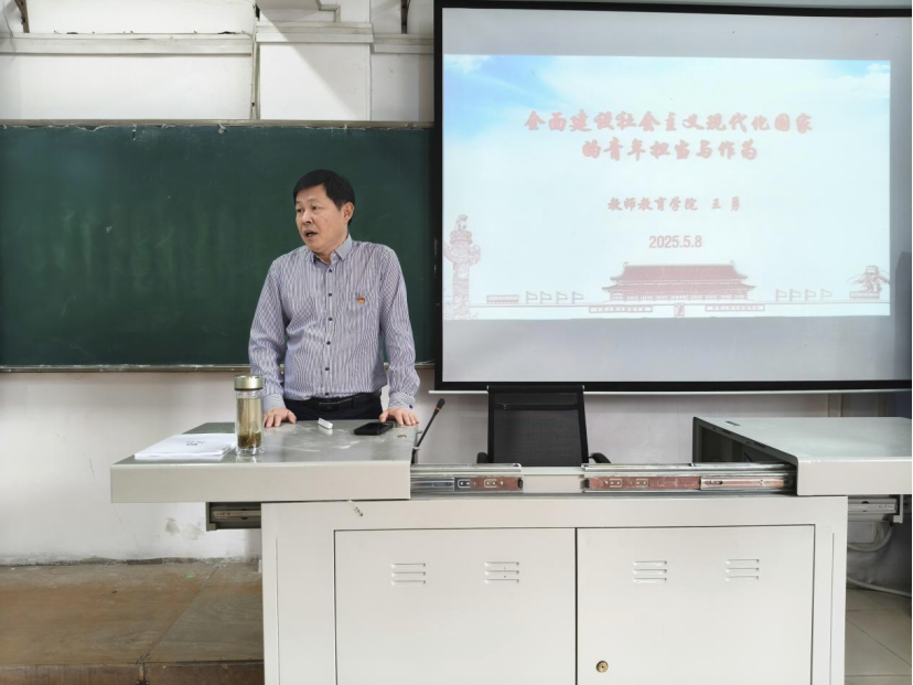 (通讯员 李金珍)5月8日午12时10分,教师教育学院院长、两训中心常务副主任王勇于5308为教育科学学院(以下简称“教科院”)发展对象培训班学员讲授党课,培训班全体学员参加。本次党课主题为《全面建设社会主义现代化国家的青年担当与作为》。