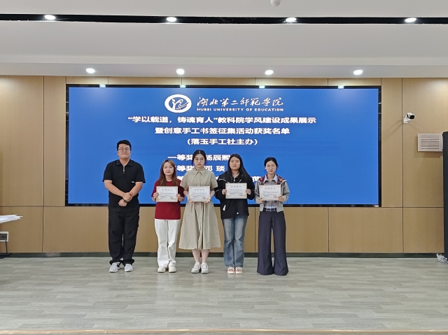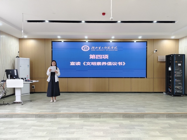 随后进入“学以载道,铸魂育人”学风建设成果展示系列活动表彰环节,学院辅导员依次为在“三字一画活动”、“读书分享活动”、“创意手工书签征集活动”、“歌唱比赛活动”中获奖的同学颁发荣誉证书。紧接着,辅导员任淑叶宣读了《教育科学学院文明素养倡议书》,从课堂文明、宿舍文明、网络文明等层面出发,以“倡议条款+践行指南”的形式明确具体要求,期望通过制度引导让文明习惯从“倡导”变为“自觉”。