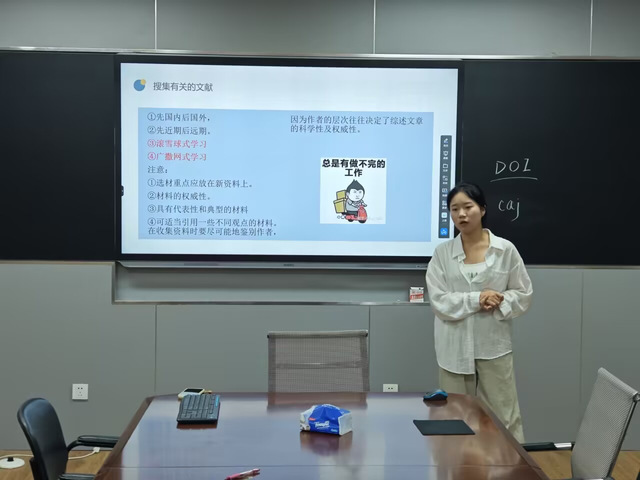 分享伊始,魏子怡首先介绍了文献综述的概念和写作的重要性。她强调文献综述不仅可以帮助我们了解该领域的研究现状和发展趋势,还可以为我们的研究提供理论基础和方法指导。接着,详细阐述了文献综述的基本组成部分,包括标题、摘要、关键词、正文、研究述评、总结与展望和参考文献等。强调了每个部分的写作要点和注意事项,如摘要应简洁明了、关键词应准确反映主题、正文应逻辑清晰、研究述评应客观公正等。