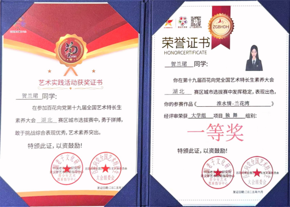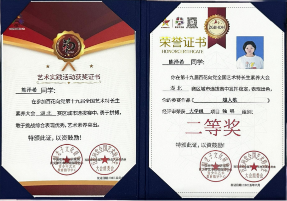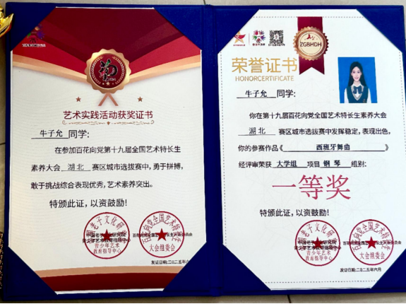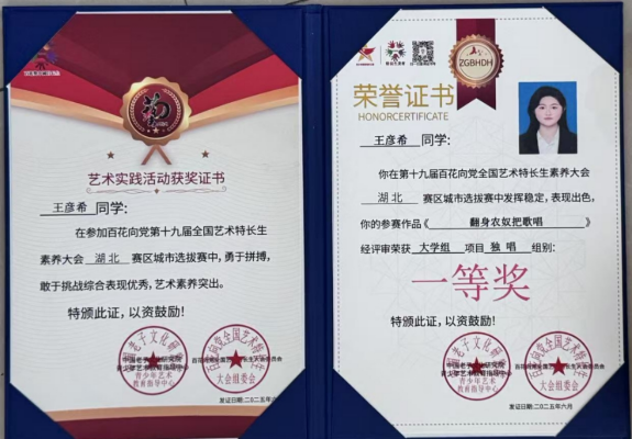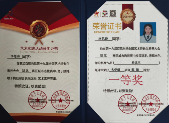 (通讯员 陈斐然)在2025年第十九届百花向党全国艺术特长生素养大会湖北赛区选拔赛中,我院在钢琴、独舞和独唱比赛中共获得省级一等奖4个,二等奖2个。