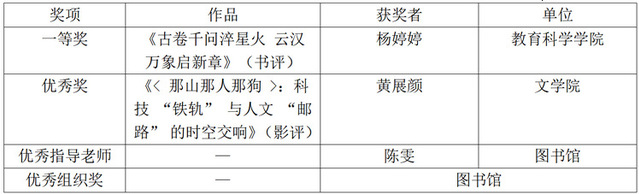 我校图书馆高度重视,于4月11日面向全校师生开展“第六届书评影评大赛校内选拔赛”,收到30篇作品,涵盖经典文学、影视作品等多个领域。经过一个多月的沟通与指导,最终向大赛组委会精心选送了教育科学学院和文学院的两件学生作品。经湖北省高校图工委阅读推广专业委员会组织专家评选,终获佳绩。
