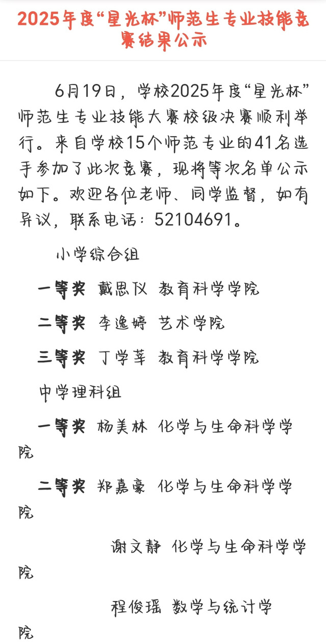 (通讯员 戴思仪 曾婧)在2025年6月,学校2025年度“星光杯”师范生专业技能大赛校级决赛顺利举行。来自学校15个师范专业的41名选手参加了此次竞赛。教科院学生在教科院的精心组织下参加了此次比赛,其中小学教育专业的戴思仪、丁学莘荣获小学综合组的一等奖和三等奖。