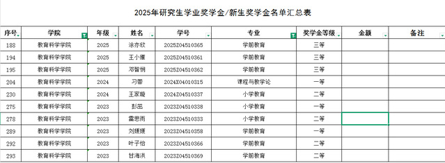 (通讯员 王家璇)近日,湖北师范大学发布了2025年研究生学业奖学金与新生奖学金评选结果的公示,我院与湖北师范大学联合培养研究生11人全部获得奖学金。其中,获一等学业奖学金3人、二等学业奖学金4人,获三等新生奖学金3人,获退役专项奖学金1人。