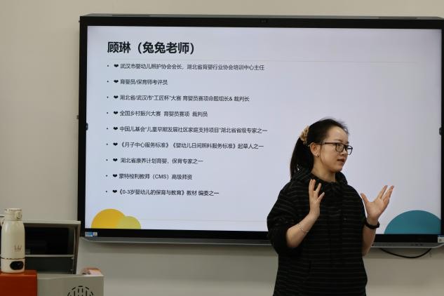 (通讯员 李雪薇)2025年11月20日,湖北第二师范学院教育科学学院23学前教育1班在《0-3岁婴幼儿保育与教育》的课堂上迎来一场干货满满的专业讲座。该课程的任课老师徐梦雪邀请了武汉市婴幼儿照护协会会长、湖北省育婴行业协会培训中心主任顾琳老师前来授课,聚焦与“0-3岁婴幼儿”为同学们带来前沿行业知识与实操技能指导。
