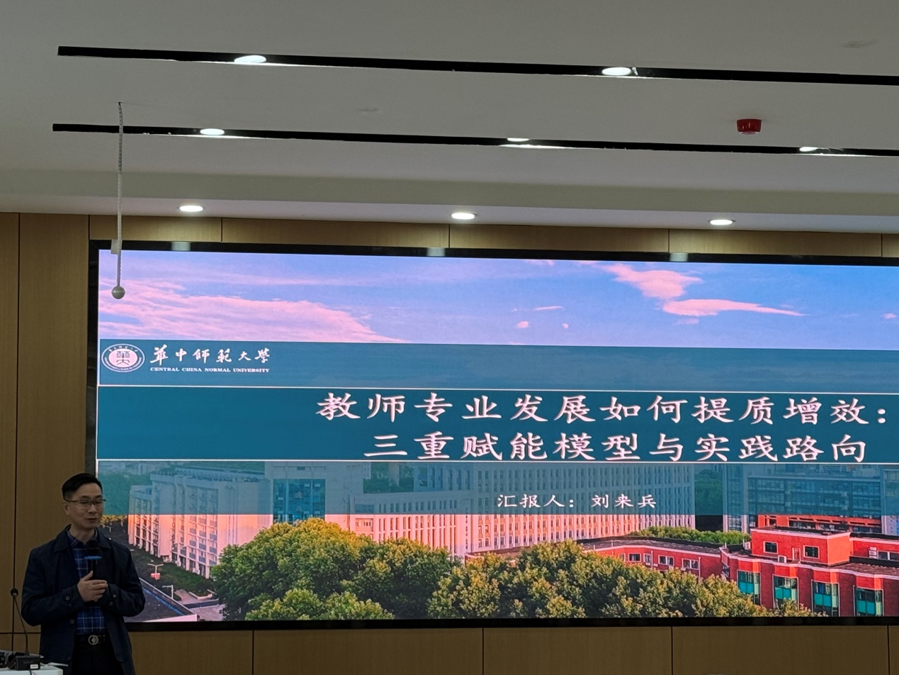 专家报告环节,华中师范大学刘来兵教授围绕《教师专业发展如何提质增效:三重赋能模型与实践路向》从研究背景、现实叩问、赋能模型、实践路向等方面进行了的精彩报告。三阶动力循环、三重赋能模型、四维生态促进等内容获得与会老师的好评。