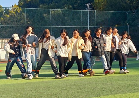 比赛过程中,志愿者始终活跃在赛场各处:有的协助参赛同学调整绑腿绳,有的手持扩音设备重申项目规则,还有的带头喊响加油口号。赛场内助威声、引导声此起彼伏,为活动增添了热烈的氛围。