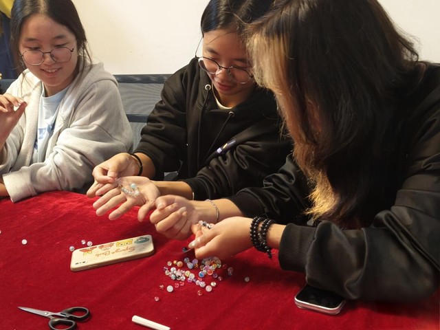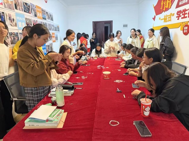 活动现场热闹而有序,两大场地形成“户外创作+室内教学”的联动氛围。西区篮球场上,前来参与的同学们或独自构思、或三五成群协作,在志愿者的耐心指导下,穿线、选珠、打结等步骤有条不紊地推进,原本零散的珠子逐渐串联成造型精巧的饰品。西四一站式学生社区内,温馨氛围同样浓厚,不少同学在课间驻足参与,一边跟着志愿者学习串珠技巧,一边交流对后续敬老活动的期待。“第一次尝试串珠,虽然过程需要耐心,但想到这些作品能为老人带去温暖,就觉得特别有意义。”参与活动的同学说道。