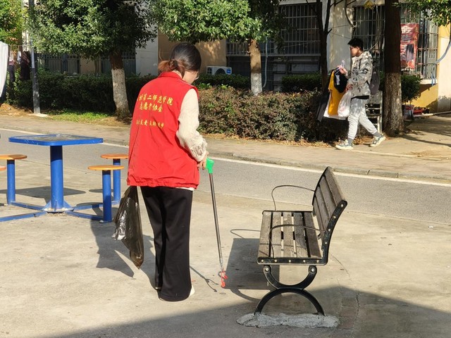 早上8:30,志愿者们在五号楼大厅集合,领取清扫工具后,在负责人的带领下前往湖口社区,并按照负责人划分的清扫区域分为两支队伍:第一小队聚焦社区花坛区域,重点清理枯枝落叶、杂草及隐藏在绿植中的白色垃圾;第二小队负责社区公共道路、楼道入口及休闲区域的清扫工作,针对路面烟头、果皮纸屑等杂物进行全面捡拾。
