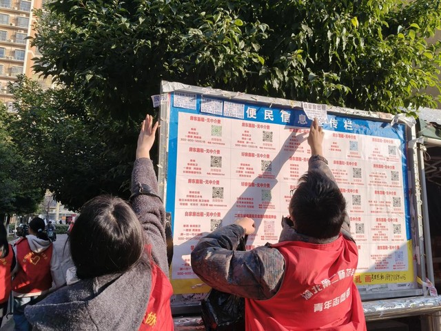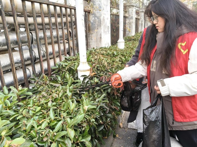第一小组的志愿者对楼道墙面、宣传栏等处的各类纸质张贴物进行耐心剥离与清理。他们耐心仔细,努力使公共墙面恢复原有的整洁面貌。第二小组的志愿者,他们使用垃圾夹捡拾路面及绿化带中的纸屑、塑料袋、烟头等零散垃圾,并使用扫帚集中清扫落叶。志愿者们认真清理每一处垃圾,力求不遗漏。