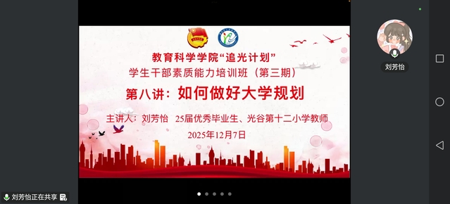 (通讯员 康佳琪)12月7日19时30分,教育科学学院(以下简称“教科院”)于腾讯会议线上举办2025“追光计划”学生干部素质能力培训班第八讲。教科院分团委副书记唐志强、学生会、分团委、青年志愿者协会全体学生干部共同参与。此次培训特别邀请到25届优秀毕业生、光谷第十二小学教师刘芳怡担任主讲人,培训主题为《如何做好大学规划》。